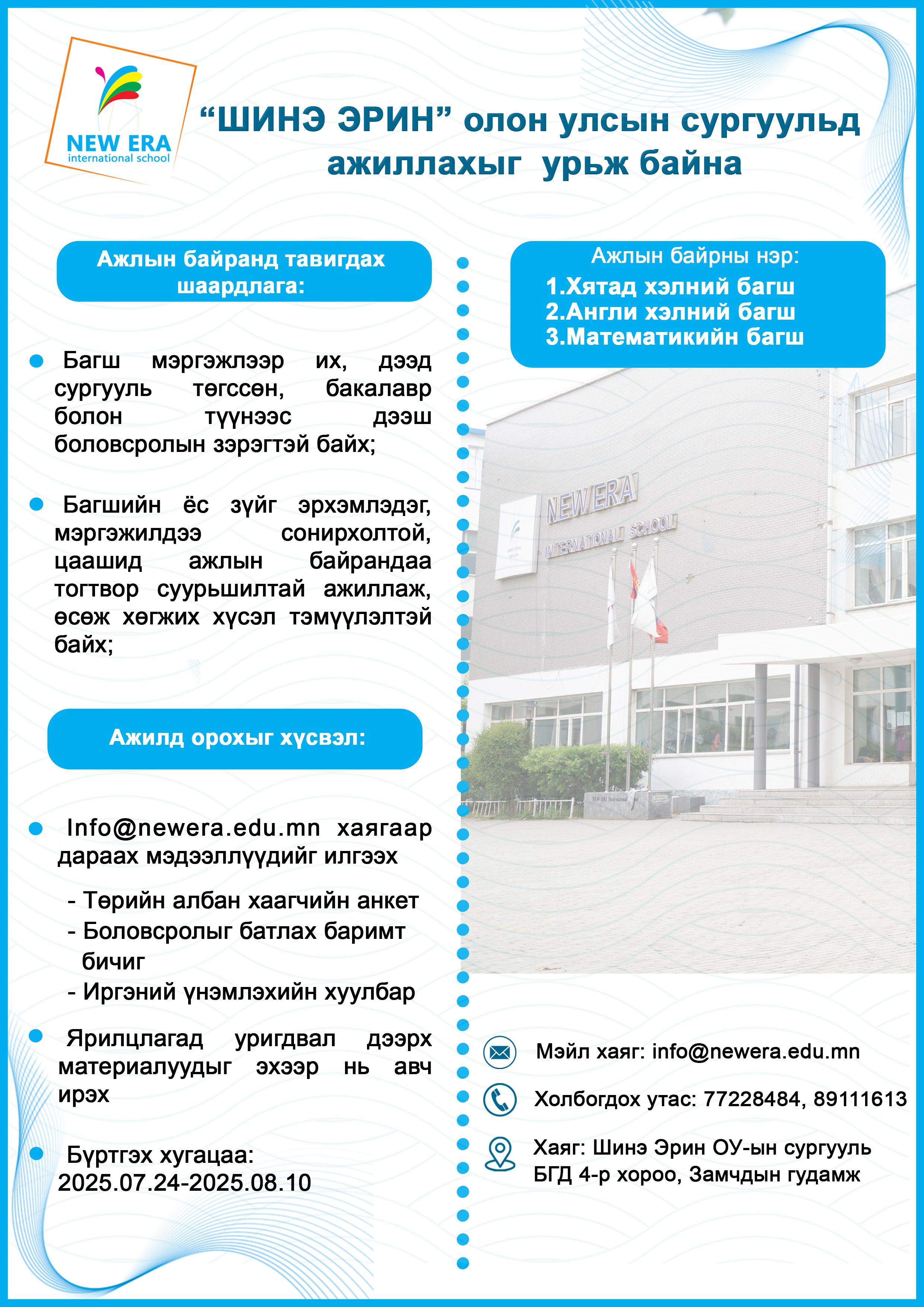 "ШИНЭ ЭРИН” олон улсын сургуульд ажиллахыг урьж байна.
