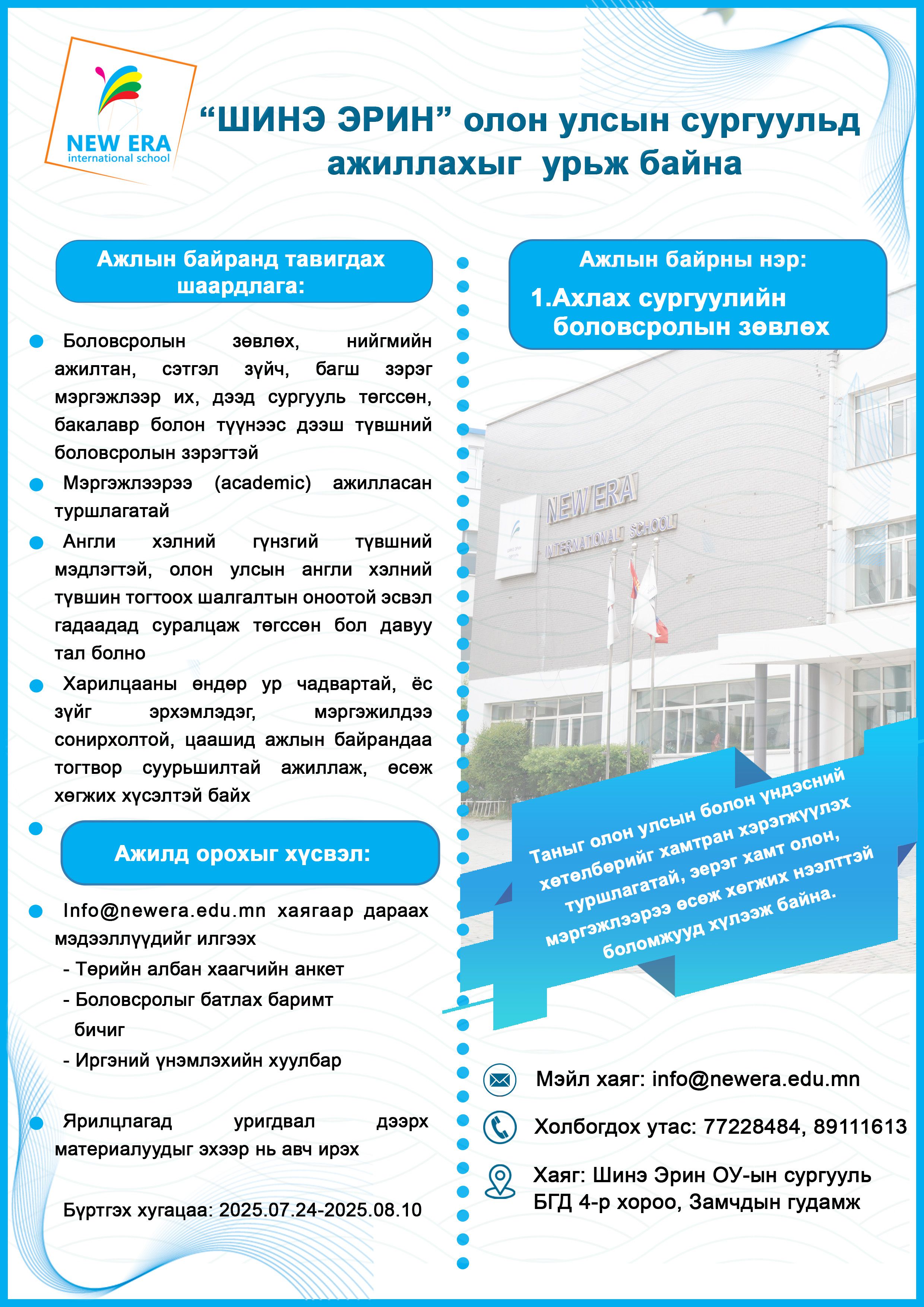 "ШИНЭ ЭРИН” олон улсын сургуульд ажиллахыг урьж байна.