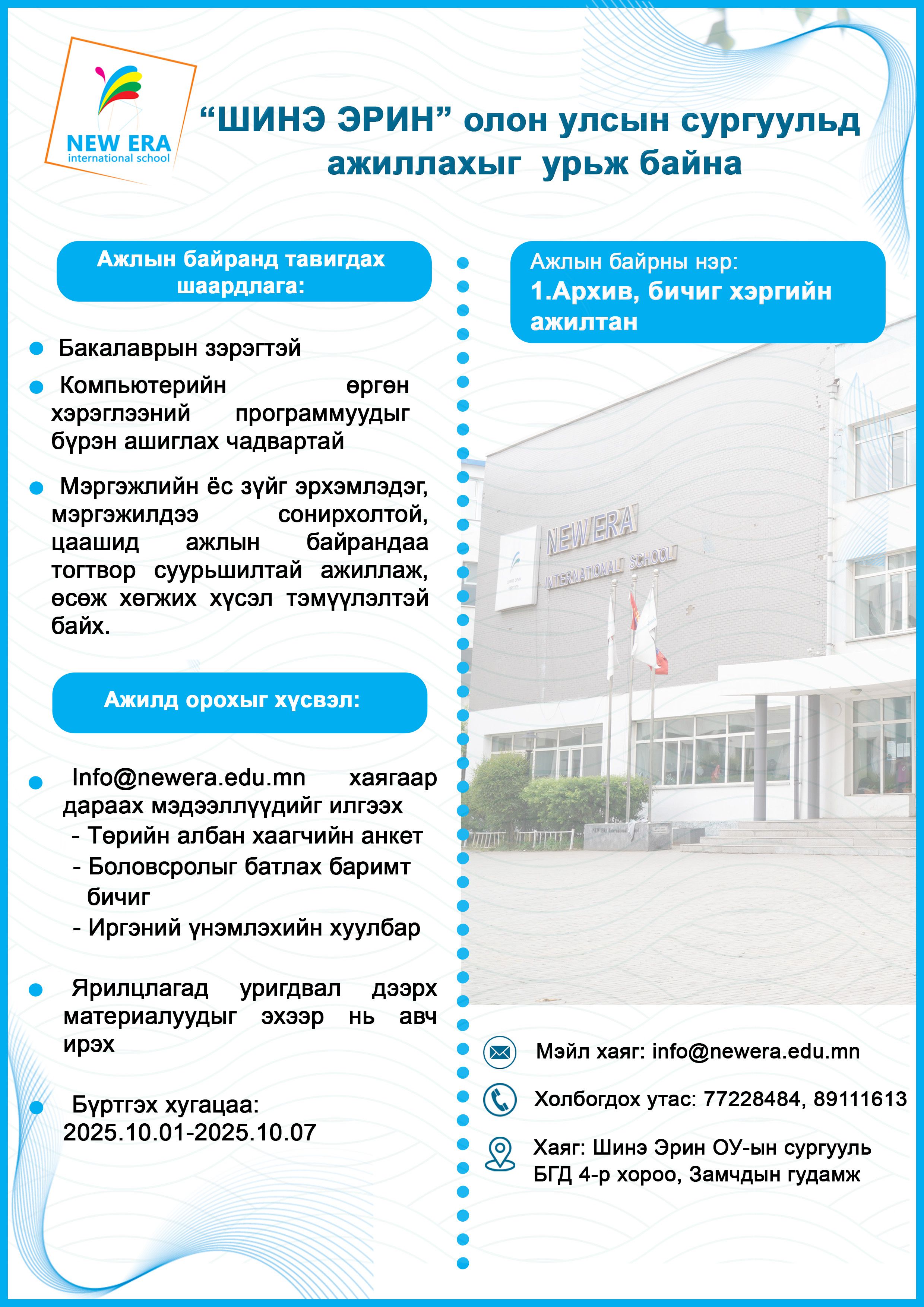 Нэмэлт мэдээлэл авахыг хүсвэл info@newera.edu.mn хаягаар хандах буюу 77228484, 89111613 утсаар холбогдоно уу.