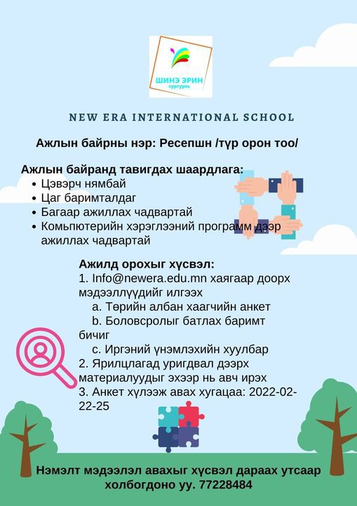"ШИНЭ ЭРИН” олон улсын сургуульд ажиллахыг урьж байна.