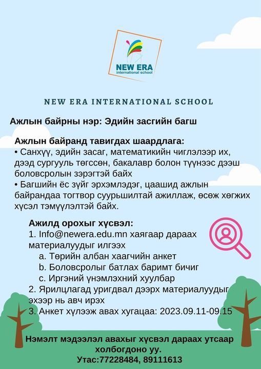 "ШИНЭ ЭРИН” олон улсын сургуульд ажиллахыг урьж байна.