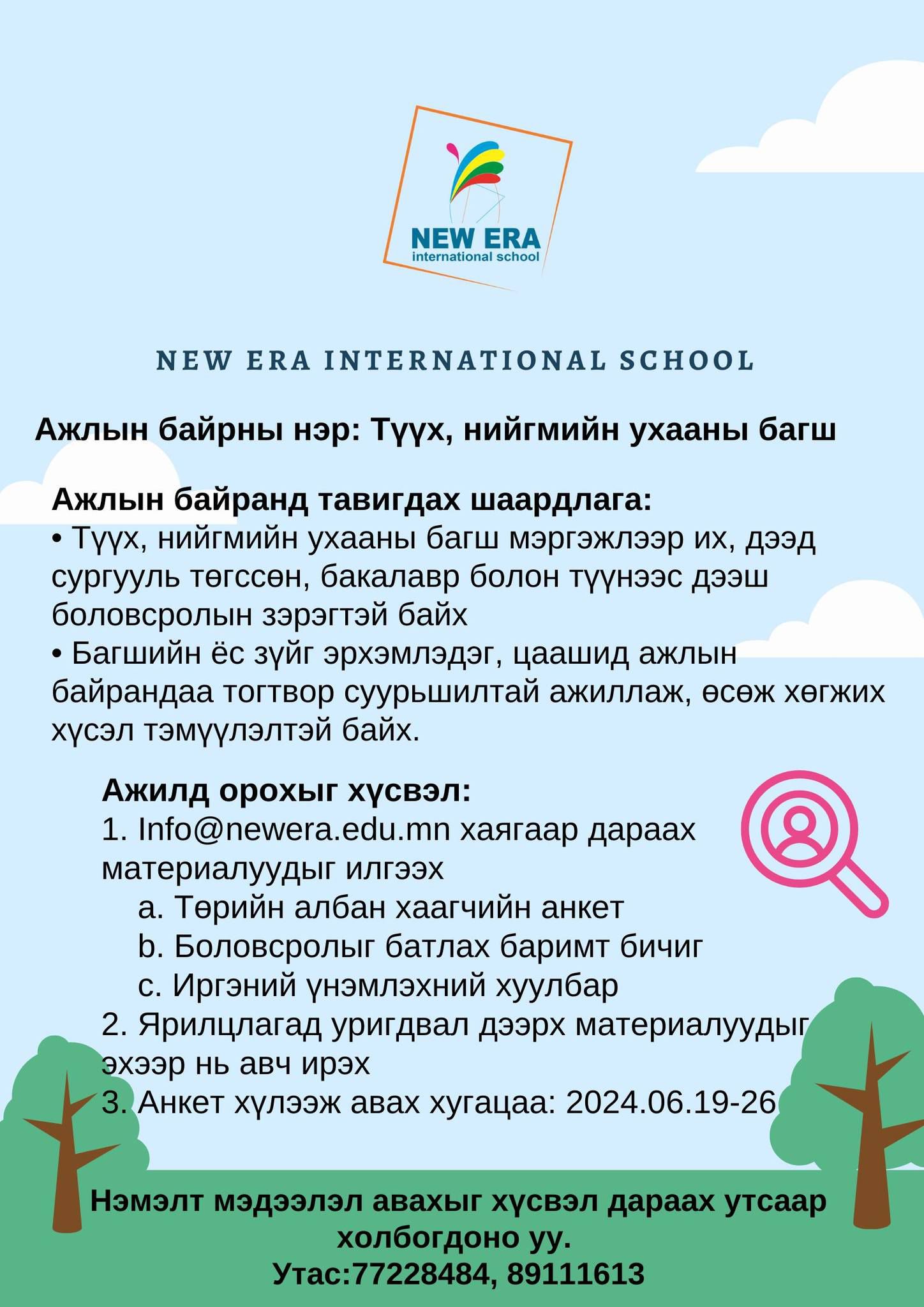 "ШИНЭ ЭРИН” олон улсын сургуульд ажиллахыг урьж байна.