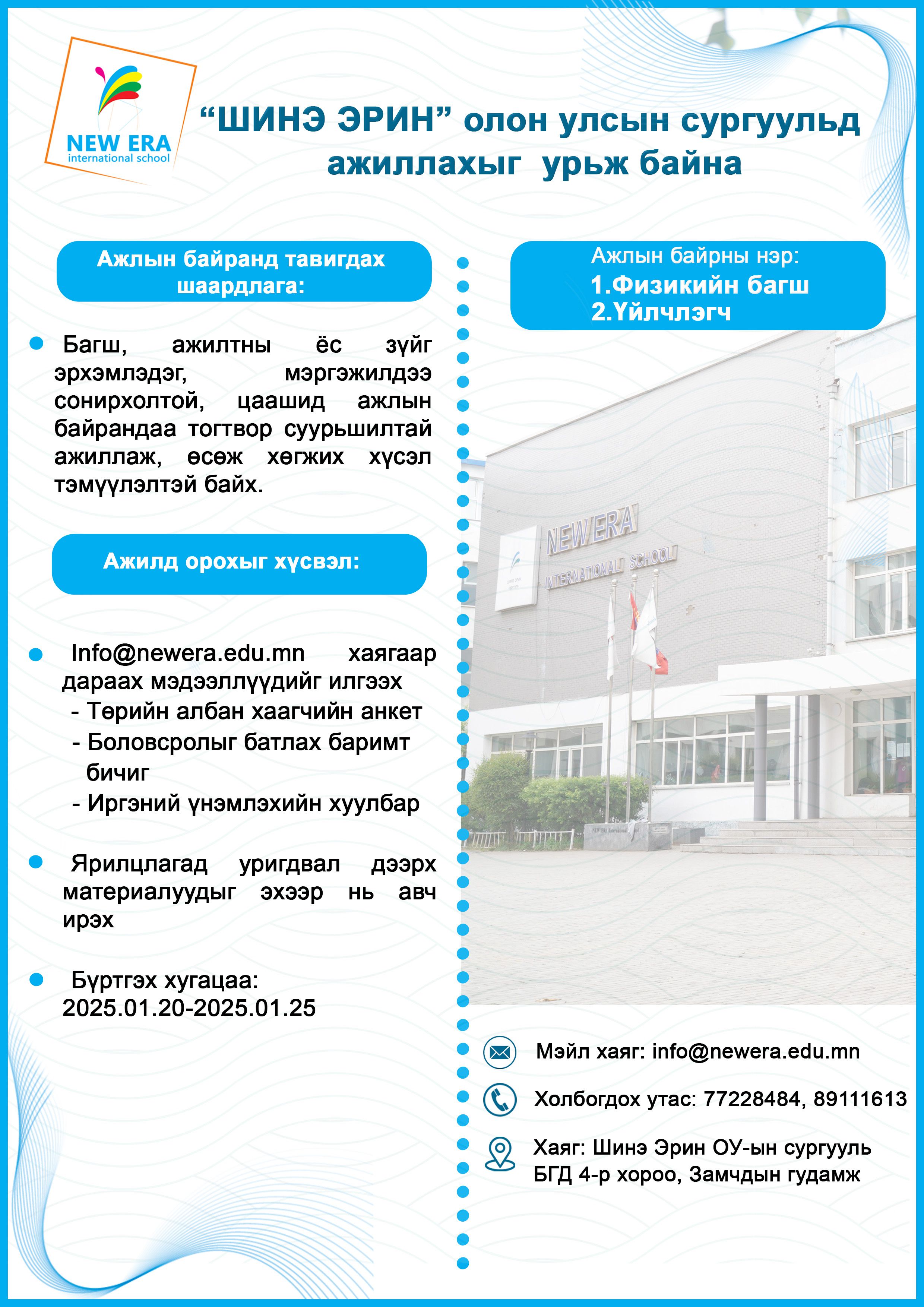 "ШИНЭ ЭРИН” олон улсын сургуульд ажиллахыг урьж байна.