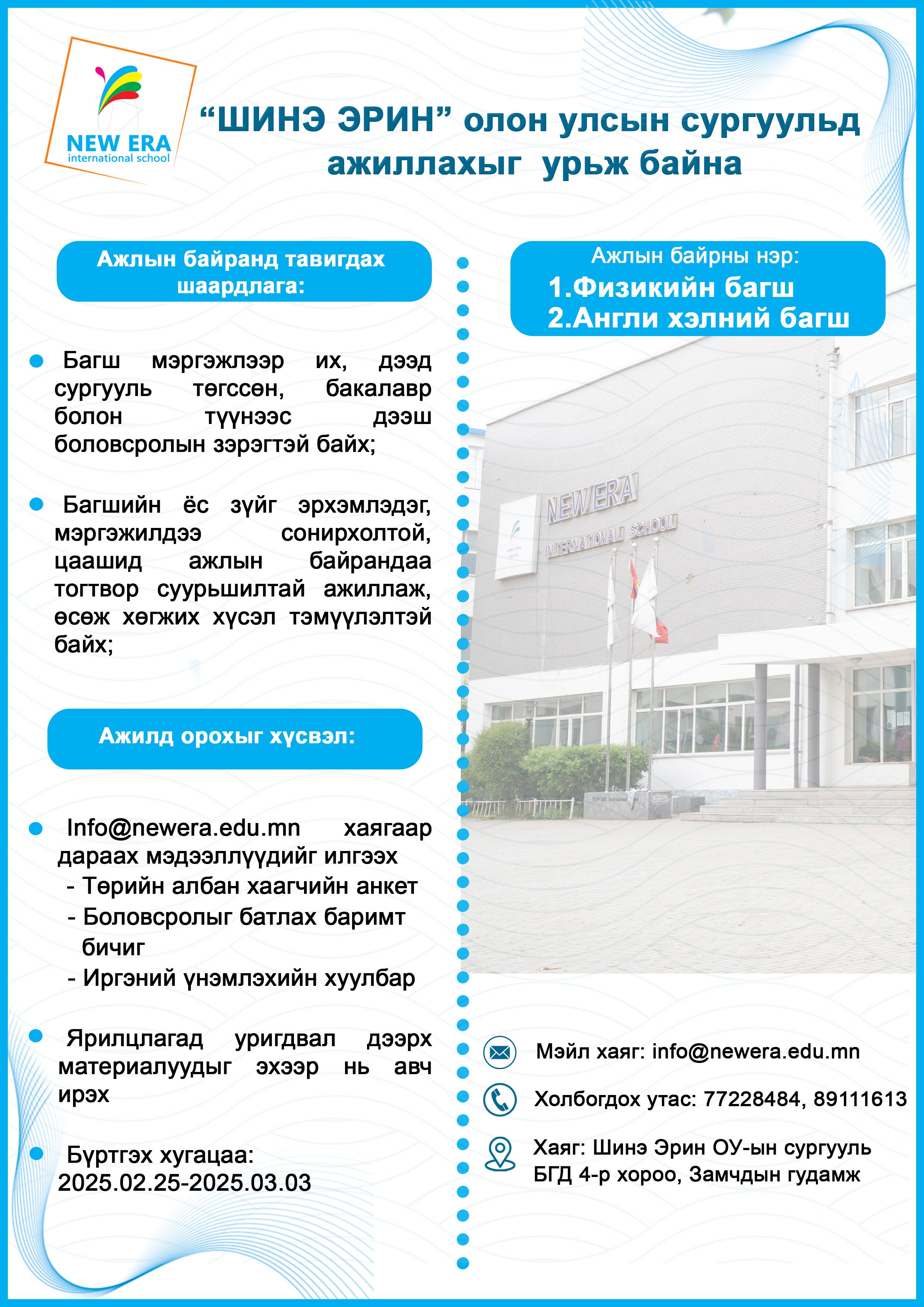 "ШИНЭ ЭРИН” олон улсын сургуульд ажиллахыг урьж байна.
