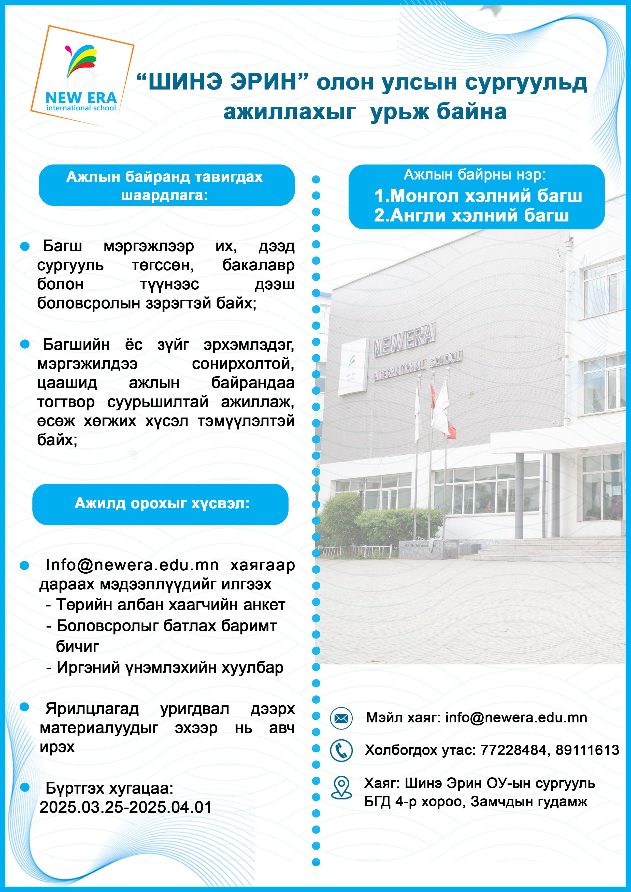 "ШИНЭ ЭРИН” олон улсын сургуульд ажиллахыг урьж байна.